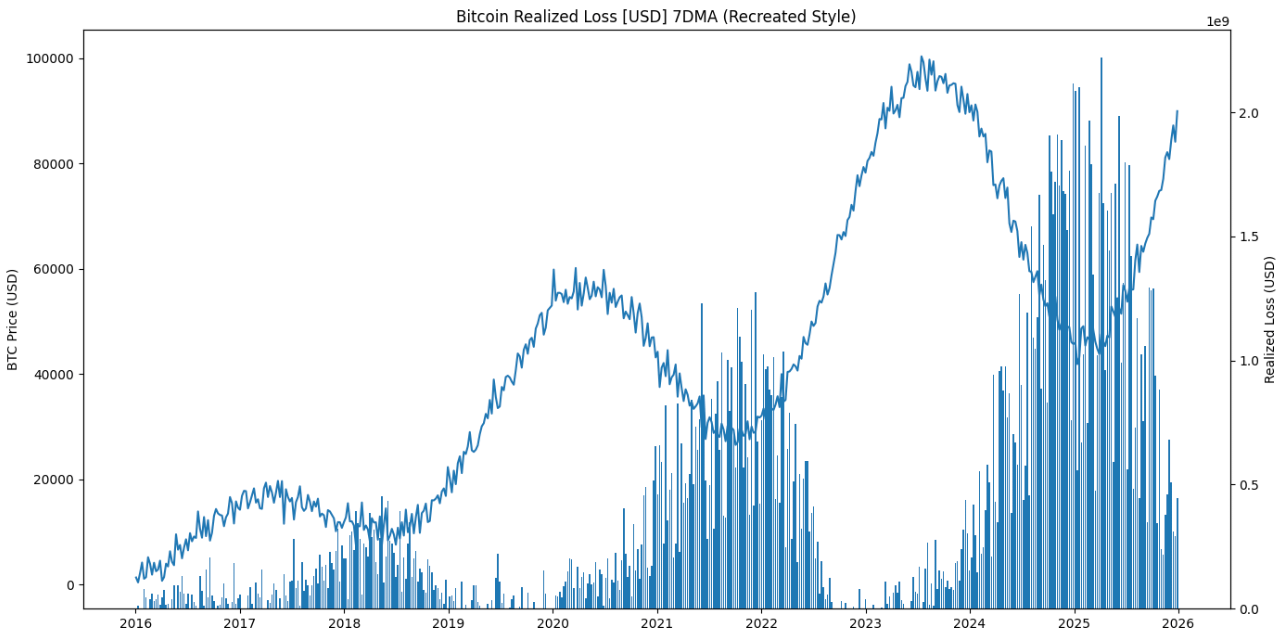 Dữ liệu on-chain vừa ghi nhận một trong những tín hiệu stress mạnh nhất của chu kỳ hiện tại. Chỉ số Bitcoin Realized Loss (7DMA) đã vượt mốc 2.3 tỷ USD — vùng giá trị trong lịch sử thường chỉ xuất hiện trong các giai đoạn bán tháo hoảng loạn hoặc những đợt shakeout cuối xu hướng.