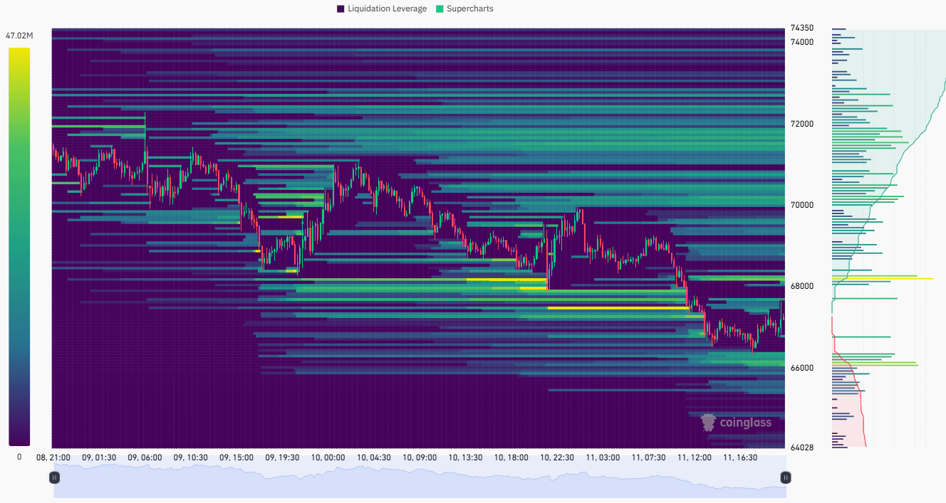 Lưu ý: Tránh giao dịch đòn bẩy lớn ở giữa vùng $67,000 vì giá có thể di chuyển khó chịu.