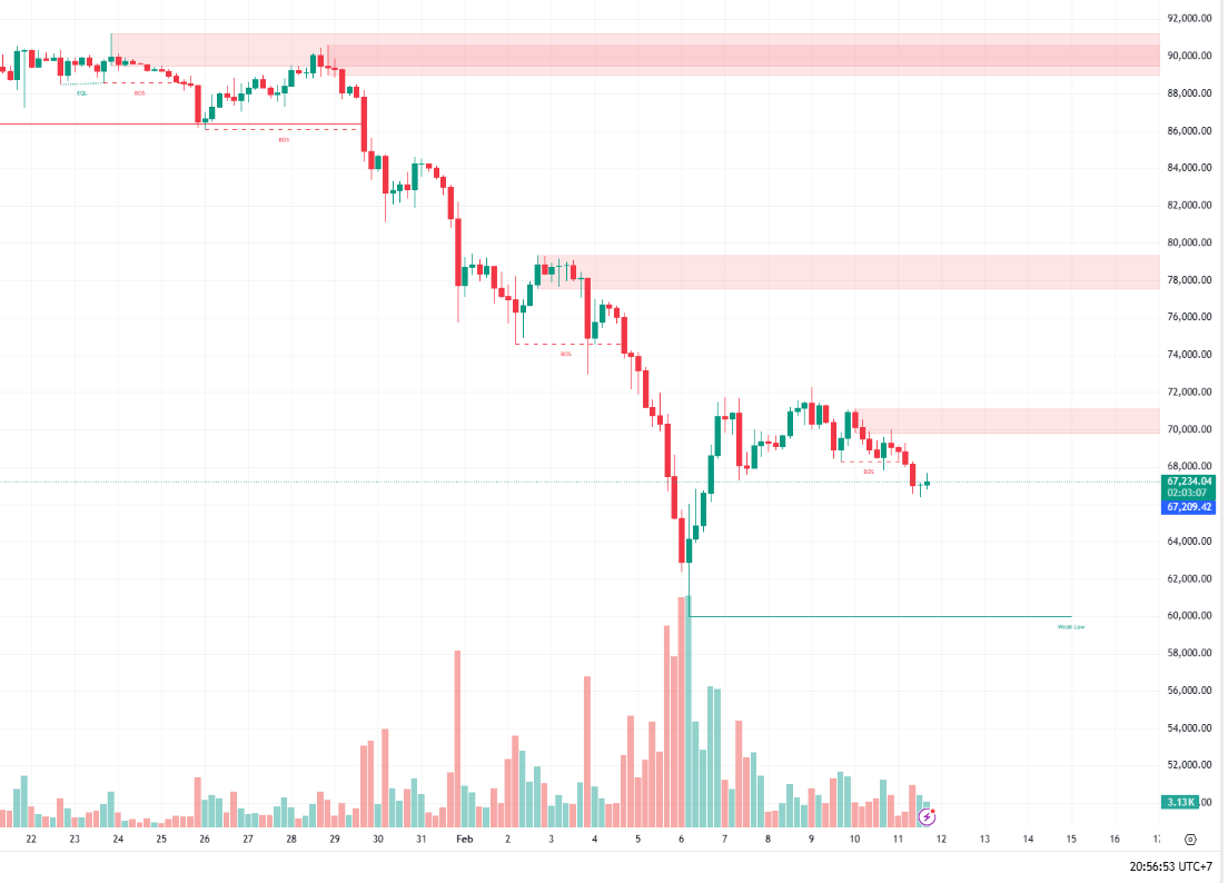 Trên biểu đồ 1H, vùng giá quanh $60,000 đã tạo thành một đáy cứng. Đây là Thành trì cuối cùng bảo vệ xu hướng tăng dài hạn.