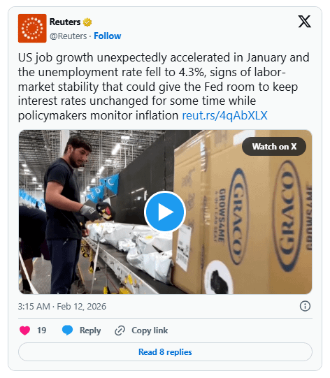 Nền kinh tế Mỹ đã tạo thêm 130.000 việc làm trong tháng Giêng, gần gấp đôi so với dự báo của giới chuyên gia. Đồng thời, tỷ lệ thất nghiệp giảm xuống còn 4,3%, cho thấy sự phục hồi mạnh mẽ của thị trường lao động. Mặc dù tỷ lệ việc làm cao là tín hiệu tích cực cho nền kinh tế nói chung, nhưng nó lại làm phức tạp triển vọng đối với các tài sản rủi ro như Bitcoin.