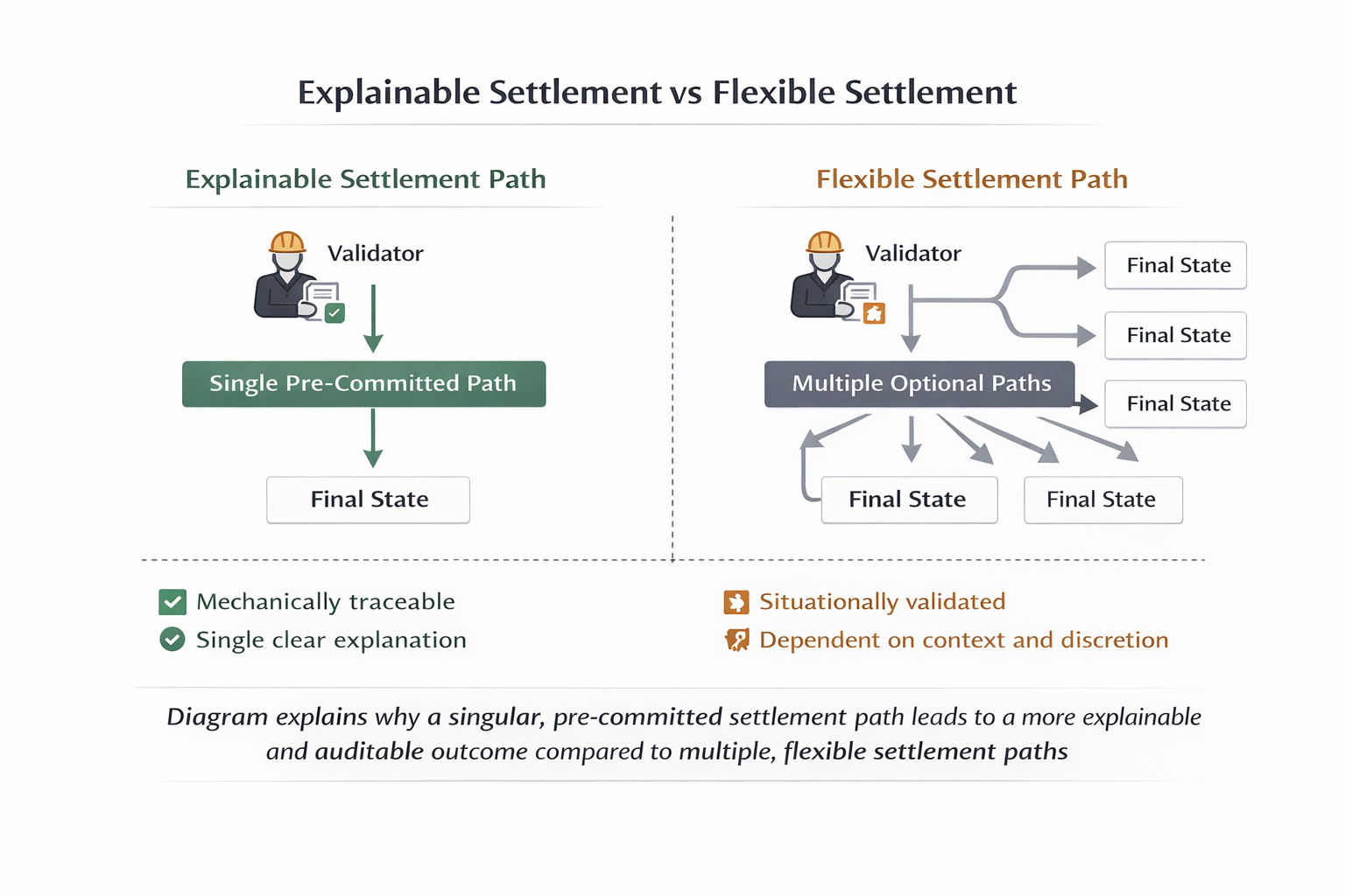 Nhiều hệ thống thanh toán cho phép nhiều lối đi thực hiện hoặc xác thực hợp lệ dưới các điều kiện biên. Trên giấy tờ, điều đó trông có vẻ bền bỉ. Có các phương án dự phòng, các lối đi thay thế, xử lý có điều kiện. Nhưng mỗi lối đi hợp lệ thêm vào tạo ra một câu chuyện khả thi khác về cách mà một kết quả đã được đạt được. Dưới áp lực, ai đó sẽ chọn lối đi nào để theo. Các xác thực phối hợp. Các nhà điều hành diễn giải ý định. Sở thích xuất hiện.