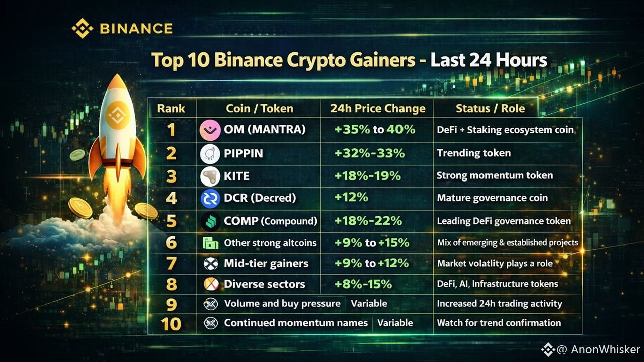 Data Explanation: These percentages represent approximate 24h gains based on Binance market rankings around current snapshot time. Exact values can shift every few minutes markets trade 24/7.