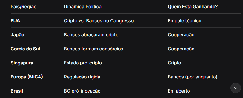 Enquanto os bancos reclamam, a indústria constrói. O que vimos na Ásia [análise anterior] é o melhor exemplo: bancos coreanos, japoneses, singapurianos e malaios não estão lutando contra stablecoins – estão se unindo a elas.