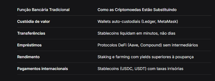 Isso não significa que os bancos vão desaparecer. Significa que: