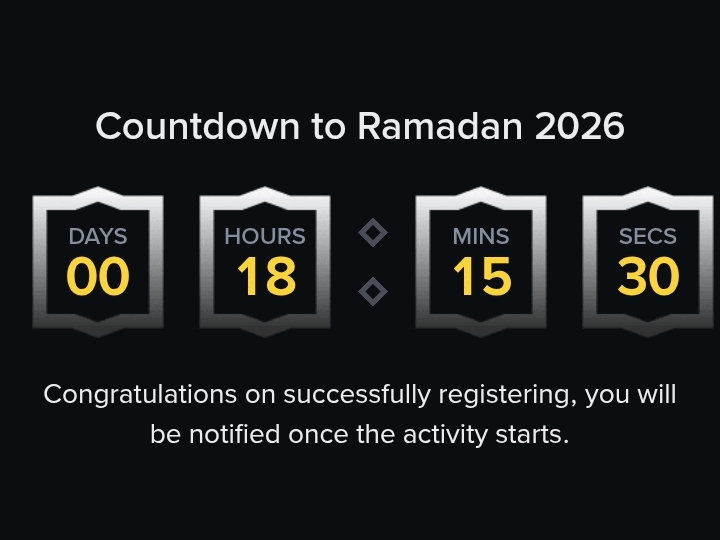 Lịch Ramadan chính thức mở cửa vào ngày 18 tháng 2 năm 2026 lúc 00:00 (UTC). Kiểm tra hàng ngày khi các hoạt động mới được mở khóa trong suốt tuần.