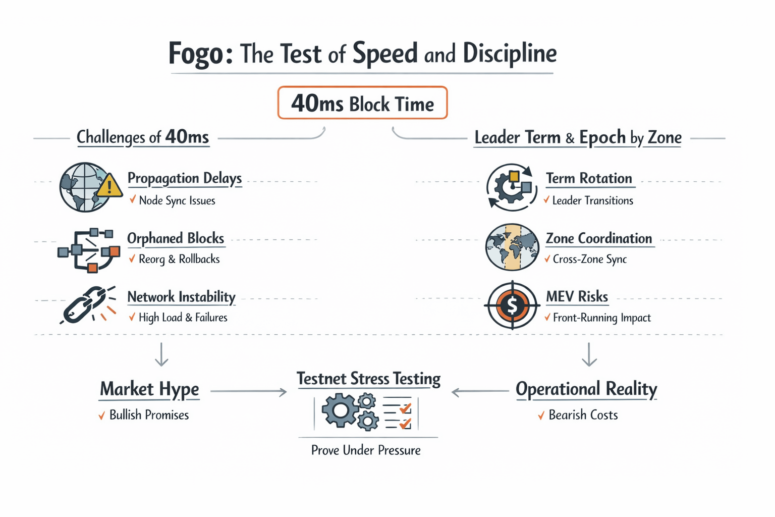 Vấn đề bắt đầu khi nhịp độ khối vượt quá nhịp độ truyền bá, bạn bắt đầu thấy nhiều khối cạnh tranh hơn, rồi tỷ lệ mồ côi tăng cao hơn, rồi các tổ chức lại làm cạn kiệt niềm tin của người dùng ngay cả khi họ không thể giải thích những gì vừa xảy ra. Tôi đã chứng kiến rất nhiều hệ thống theo đuổi tốc độ để cảm thấy mượt mà, và rồi sụp đổ về danh tiếng sau một vài giao dịch bị lật ngược. Nếu Fogo muốn 40ms trở thành một nhịp thực sự, mạng thử nghiệm phải nhìn thẳng vào các số liệu xấu, thời gian truyền bá như một phân phối, tỷ lệ mồ côi, độ sâu tổ chức lại, và thời gian mà mạng cần để trở lại trạng thái ổn định sau một cú trượt.
