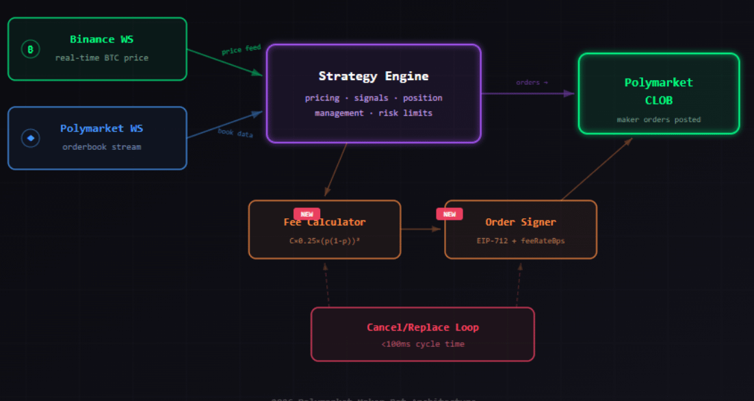 Bạn cần giám sát đồng thời: nguồn giá bên ngoài (ví dụ WebSocket của Binance); đơn hàng hiện tại của bạn trên Polymarket.