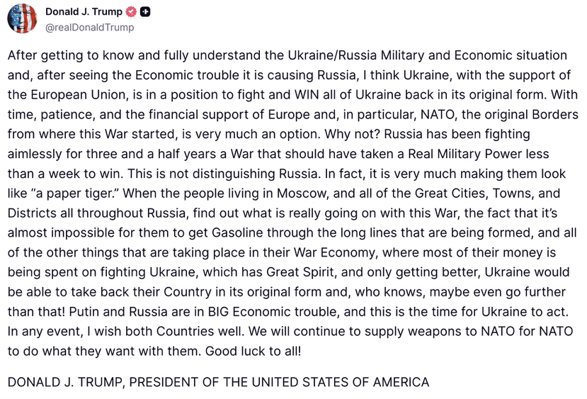 Trump chơi con bài Trump của mình rằng ông (MỸ 🇺🇸) đã tham gia gián tiếp vào cuộc chiến thông qua NATO vì ông cung cấp vũ khí cho NATO và NATO đã cung cấp vũ khí cho Ukraine 🇺🇦 và nếu Nga 🇷🇺 trả đũa bất kỳ quốc gia nào đã cung cấp vũ khí cho ông, điều đó có nghĩa là ông đang chống lại NATO và tất cả các thành viên NATO đứng cùng nhau chống lại Nga trong CUỘC CHIẾN NATO - NGA.