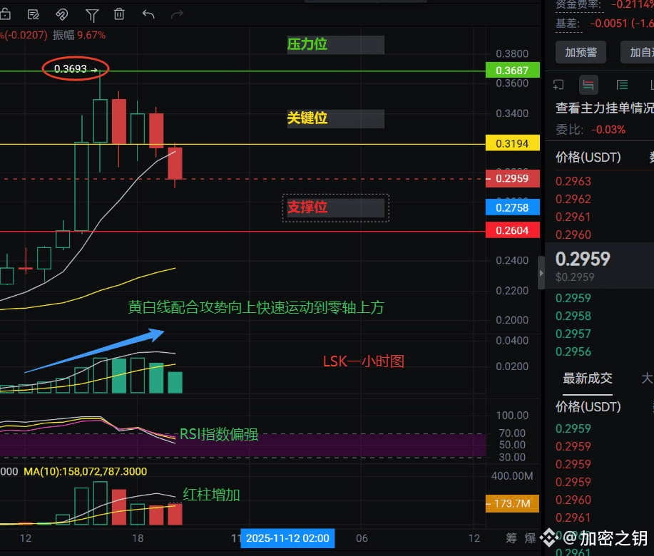 三个致命信号:第一,价格在0.3194关键位遇阻明显;第二,多空比0.83显示多数人在做多,这就是反向指标;第三,RSI虽然偏强,但红柱增加暴露了主力真实意图。