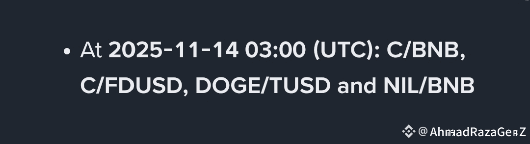 At 2025-11-14 🕒03:00(UTC) :C/BNB,C/FDUSD,DOGE/TUSD & NIL/BNB ❌🚫🚨📢📢📢📢. #DelistingAlert #spotdelisting #viralpost #BinanceVietnamSquare #PowellWatch $NIL $DOGE $C