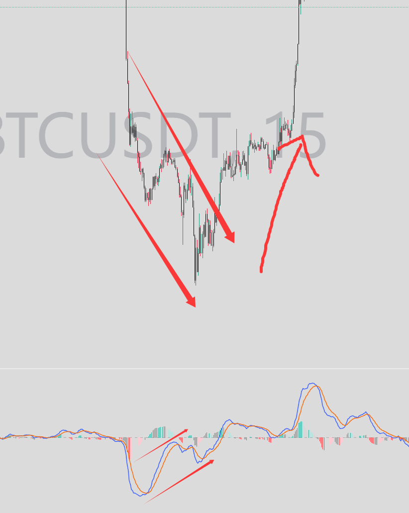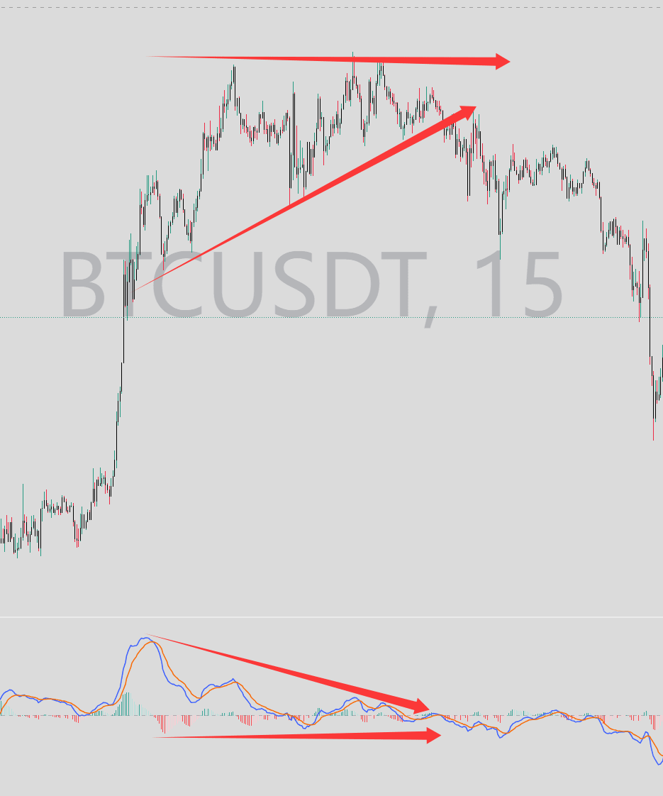Phân kỳ đỉnh: có nghĩa là tạo ra đỉnh mới nhưng MACD không tạo ra đỉnh mới thậm chí ngày càng thấp hơn. Có nghĩa là giá bị đẩy lên, giống như mang theo một thùng nước lớn leo cầu thang, lực mua không theo kịp, sức mạnh không đủ. Mức độ 15 phút phía dưới của BTC phản ánh rất tốt sự thiếu hụt động năng tăng giá, và điều đến sau đó chính là sự giảm giá.