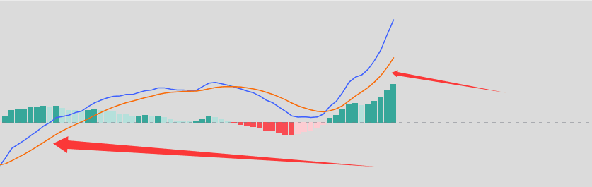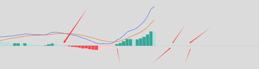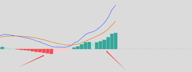 Tiếp theo hãy xem đường chậm của chúng ta, tức là đường màu vàng này, rõ ràng chậm hơn rất nhiều so với đường màu xanh lam, đây chính là cảm xúc của thị trường trong thời gian dài, cũng có thể nói rằng trong tháng vừa qua mọi người muốn mua rau nhưng đường chậm (trong năm qua) mọi người là muốn ăn thịt, đó là thái độ trung bình của mọi người trong quá khứ. DIF cắt lên DEA: cho thấy cảm xúc hiện tại bắt đầu chuyển từ bán sang mua. DIF cắt xuống DEA: cho thấy cảm xúc hiện tại chuyển từ mua sang bán. Đây chỉ là điểm chuyển của cảm xúc, không phải là điểm chuyển của giá. Giá rất có thể đã chuyển trước đó, MACD chỉ để xác nhận.