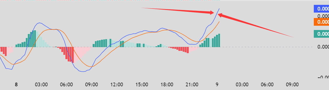 Cũng chính là đường màu xanh lam này, DIF phản ánh "cảm xúc hiện tại" của thị trường đường EMA ngắn hạn phản ứng nhanh, đại diện cho thái độ của thị trường trong thời gian gần đây. Giá trị DIF càng lớn (càng cao trên trục 0), cho thấy cảm xúc mua càng mạnh; càng sâu dưới trục 0, cho thấy cảm xúc bán càng mạnh. Hiện tại nhìn vào bức tranh này, lực mua rất mạnh! Bạn có thể coi nó như mọi người trong khung thời gian này muốn mua gì, là muốn mua rau hay muốn mua thịt~