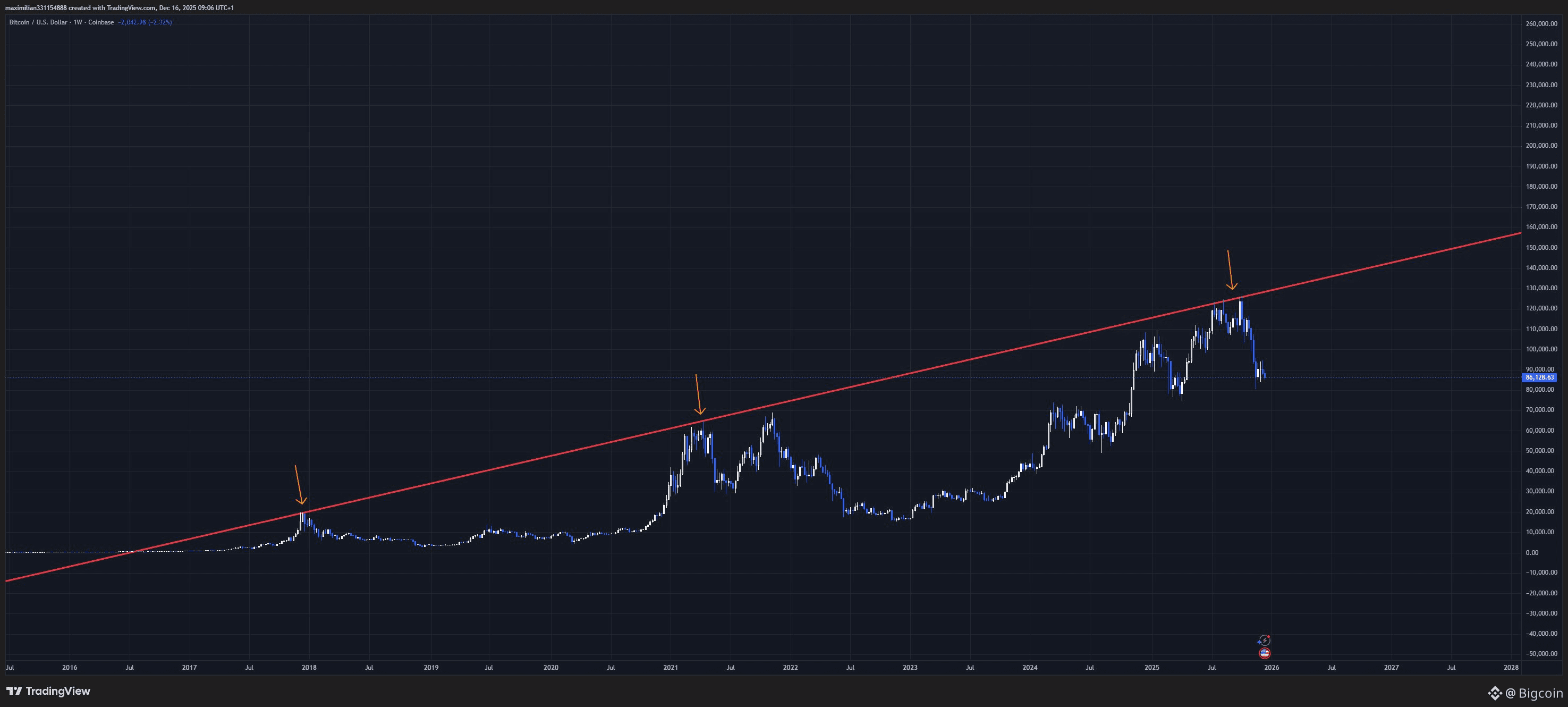 Thật sự là hiếm khi mình thấy một chart mà nó thể hiện khá rõ ràng xu hướng như thế này. Đó là đường trendline kháng cự dài hạn của Bitcoin, kéo xuyên qua nhiều chu kỳ. Mỗi lần $BTC chạm vào đường này trong quá khứ đều tạo đỉnh rồi bị đạp xuống. Nếu theo dữ liệu từ lịch sử thì quả thật là không lệch một chút nào.