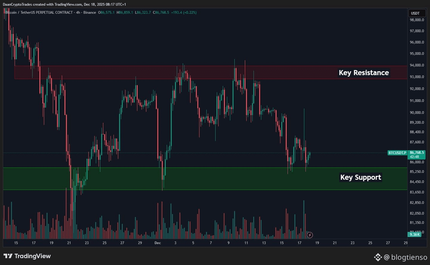 Sau 4 tuần trôi qua, $BTC gần như không thay đổi điều gì về mặt cấu trúc tổng thể: giá vẫn bị “nhốt” trong cùng một vùng biên quen thuộc. Không breakout, không breakdown rõ ràng. Chỉ là những nhịp lên – xuống liên tục trong một thị trường nhiễu và thiếu định hướng. Điều đáng chú ý không nằm ở giá, mà nằm ở tâm lý thị trường.