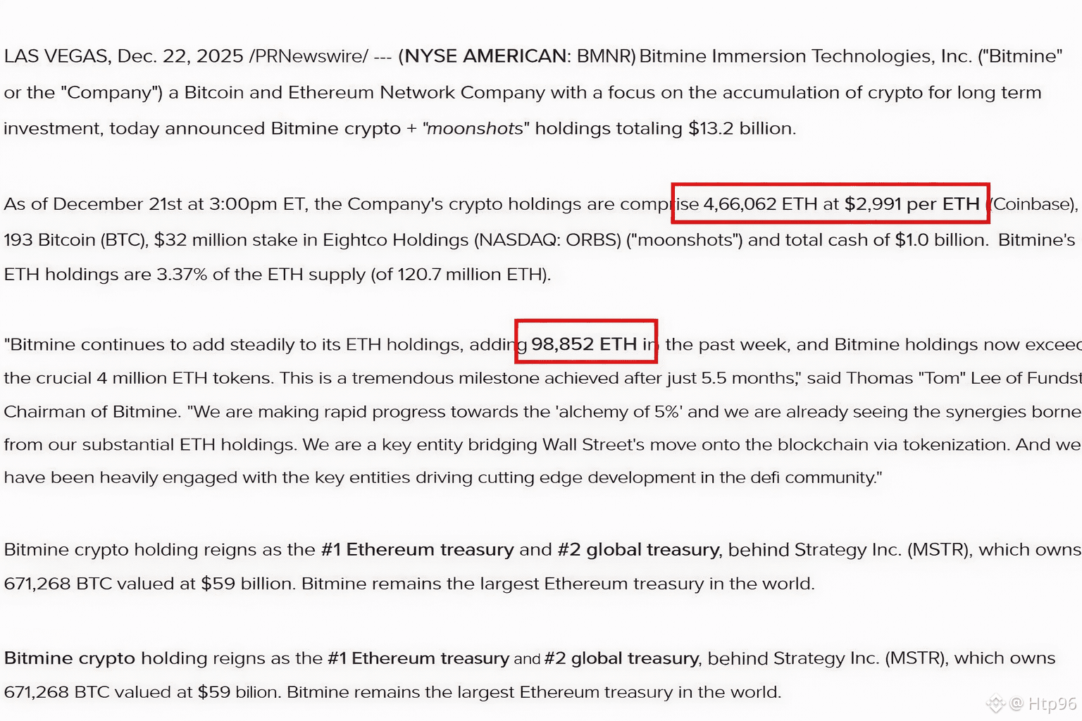 Sau thương vụ này, tổng lượng ETH mà Bitmine đang sở hữu đã lên tới 4.066.062 $ETH , với giá trị ước tính khoảng 12,45 tỷ USD.
