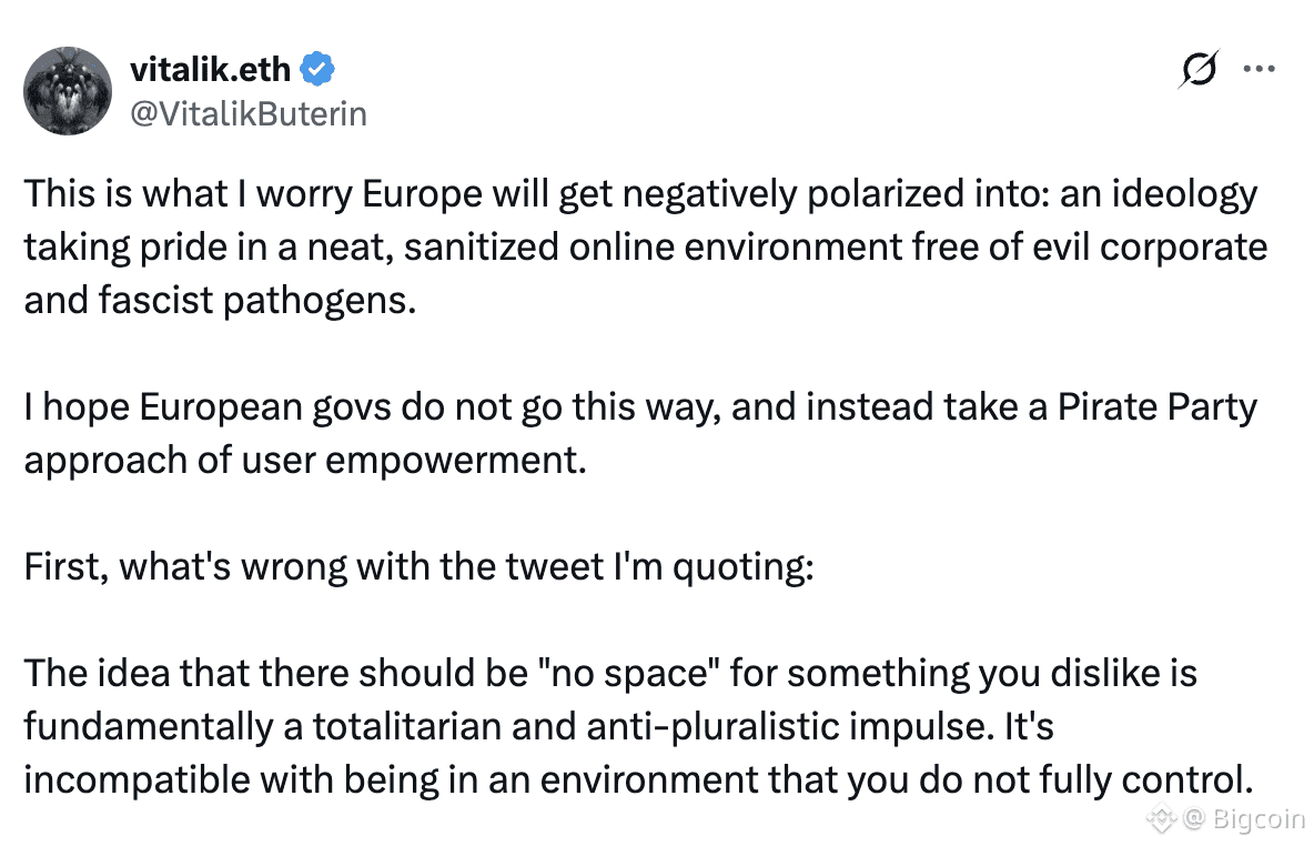 Vitalik mới đây đã chỉ trích cách tiếp cận “zero-space” của EU trong Đạo luật Dịch vụ Kỹ thuật số (DSA), cho rằng việc cố gắng loại bỏ hoàn toàn một số loại phát ngôn hay sản phẩm không chỉ là vấn đề quản lý, mà còn phản ánh một xu hướng chống lại tính đa nguyên (anti-pluralistic) trong xã hội.