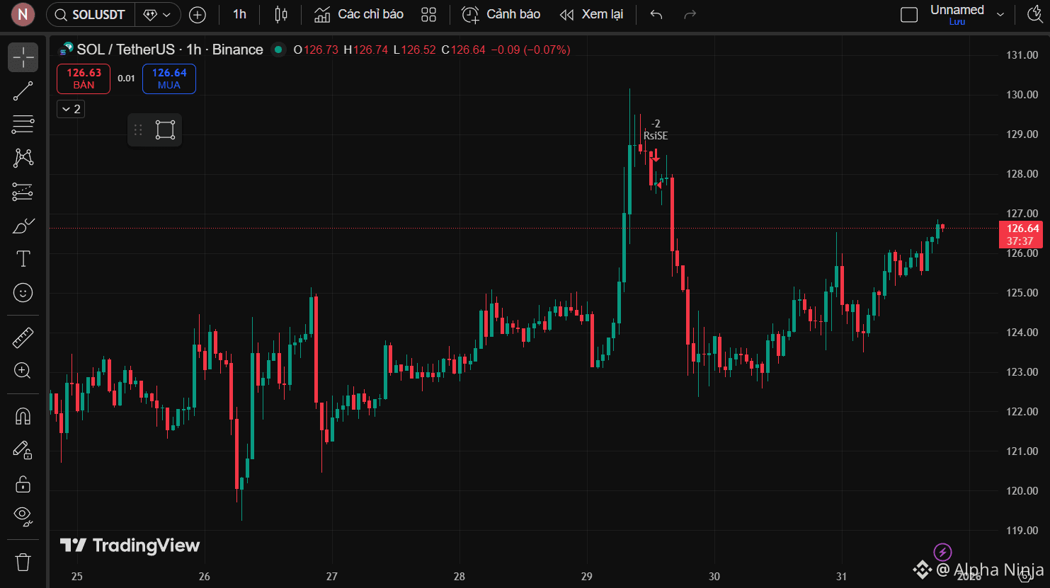 Đám đông đang ngơ ngác khi nhìn Solana không hề sụp đổ sâu hơn mà trái lại, đang giữ vững cấu trúc phục hồi quanh mốc 126.64 USD. Những người từng rời bỏ vị thế trong hoảng loạn khi giá nhúng xuống vùng 120 USD hiện đang rơi vào trạng thái tiến thoái lưỡng nan khi nến 1H liên tục đóng xanh dứt khoát.