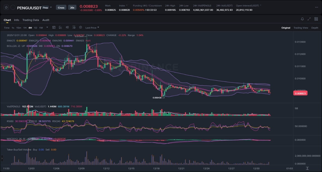 Lịch sử gần đây của PENGU trên biểu đồ 4 giờ có thể được chia thành hai giai đoạn khác nhau. Giai đoạn đầu, kéo dài phần đầu tháng 12, là một giai đoạn phân phối rõ ràng và mạnh mẽ. Người bán đã kiểm soát chặt chẽ, đẩy giá xuống từ các mức trên 0.01300 trong một loạt các sóng giảm mạnh. Giai đoạn này được đánh dấu bởi độ biến động cao, rõ ràng trong sự mở rộng rộng của các dải Bollinger, và một cấu trúc thị trường giảm giá rõ ràng với các đỉnh thấp hơn và đáy thấp hơn. Các Đường Trung Bình Động (EMA) nghiêng dốc xuống, đóng vai trò như kháng cự động và xác nhận sức mạnh của xu hướng do người bán điều khiển. Tuy nhiên, động lượng giảm này cuối cùng đã tìm thấy một đáy quanh mức 0.008438 giữa tháng 12. Đây đánh dấu sự khởi đầu của giai đoạn thứ hai, và hiện tại, giai đoạn: một sự hợp nhất kéo dài. Kể từ khi thiết lập đáy cục bộ này, PENGU đã chuyển từ một môi trường có xu hướng sang một môi trường bị ràng buộc trong phạm vi. Hành động giá đã trở nên lộn xộn và không có định hướng, dao động trong một kênh ngang được xác định rõ. Sự chuyển đổi này là một ví dụ điển hình của một thị trường chuyển từ trạng thái mất cân bằng (xu hướng) sang trạng thái cân bằng (phạm vi) khi người mua và người bán đạt được một thỏa thuận giá tạm thời. Câu hỏi chính bây giờ là liệu phạm vi này có đại diện cho một giai đoạn tích lũy trước khi đảo chiều, hay chỉ đơn giản là một sự tạm dừng trước khi xu hướng giảm trước đó tiếp tục.