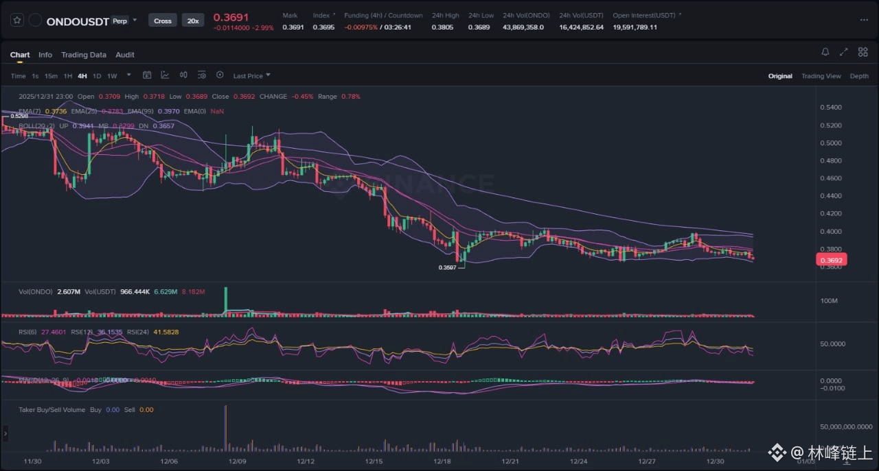 The 4-hour chart for ONDOUSDT reveals a clear market structure in transition. Following an impulsive downtrend from the highs above 0.5200, price found support around the 0.3500 level in mid-December. Since then, the asset has entered a horizontal consolidation phase. Two key elements are observable: first, a significant contraction of the Bollinger Bands, which are squeezing tightly around the price, signaling a state of low volatility and market equilibrium. Second, trading volume has diminished and flattened during this sideways period, which is typical of a consolidation or accumulation phase. The Relative Strength Index (RSI) is hovering near the 40 mark, indicating a lack of decisive momentum. The main bias is currently neutral with a slight bearish tilt. This is because while the downward momentum has paused, the price has not yet invalidated the preceding bearish trend by printing a convincing higher high.