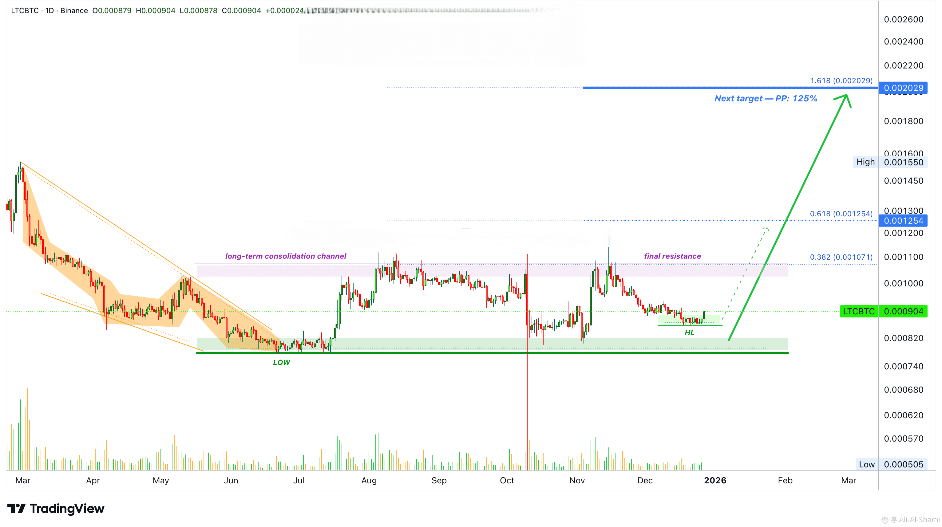 LTCBTC يتحرك ضمن قناة جانبية صعودية—توحيد—نشطة منذ مايو. على الفور، يتم العثور على مقاومة عند 0.001071، المنطقة الأرجوانية على الرسم البياني. أنتج هذا المستوى أول رفض في أغسطس، ثم مرة أخرى في أكتوبر وأخيرًا مرة أخرى في نوفمبر، الشهر الماضي.
