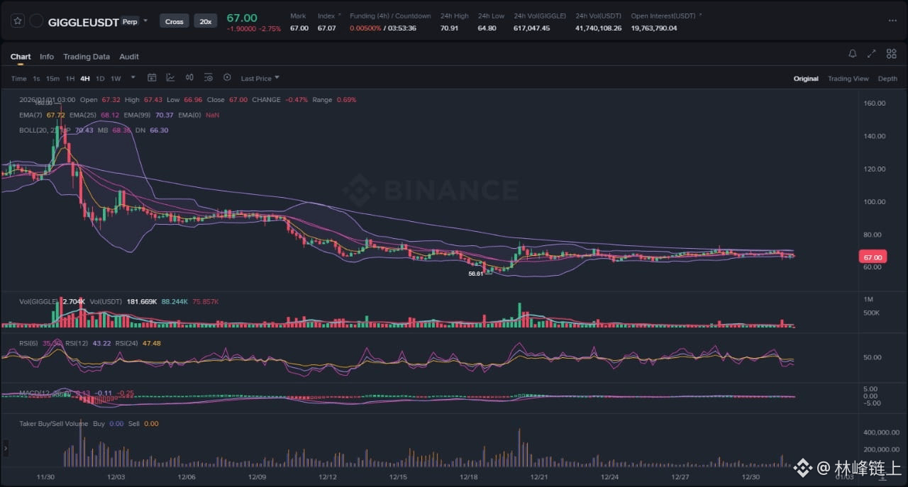 The GIGGLEUSDT perpetual contract is trading in a state of pronounced consolidation following a severe downtrend that commenced in late November. The asset experienced a cascade from levels above 130, ultimately finding a floor in the mid-50s. Since early December, however, the directional momentum has completely evaporated, replaced by a sideways chop within an increasingly narrow price band. This prolonged period of range-bound activity suggests that the initial selling pressure has been absorbed, but significant buying demand has not yet emerged to initiate a confident reversal. The market is in a wait-and-see mode, with participants poised for the next clear signal of intent from either side. The current price is therefore at a critical juncture, representing the midpoint of this established equilibrium.