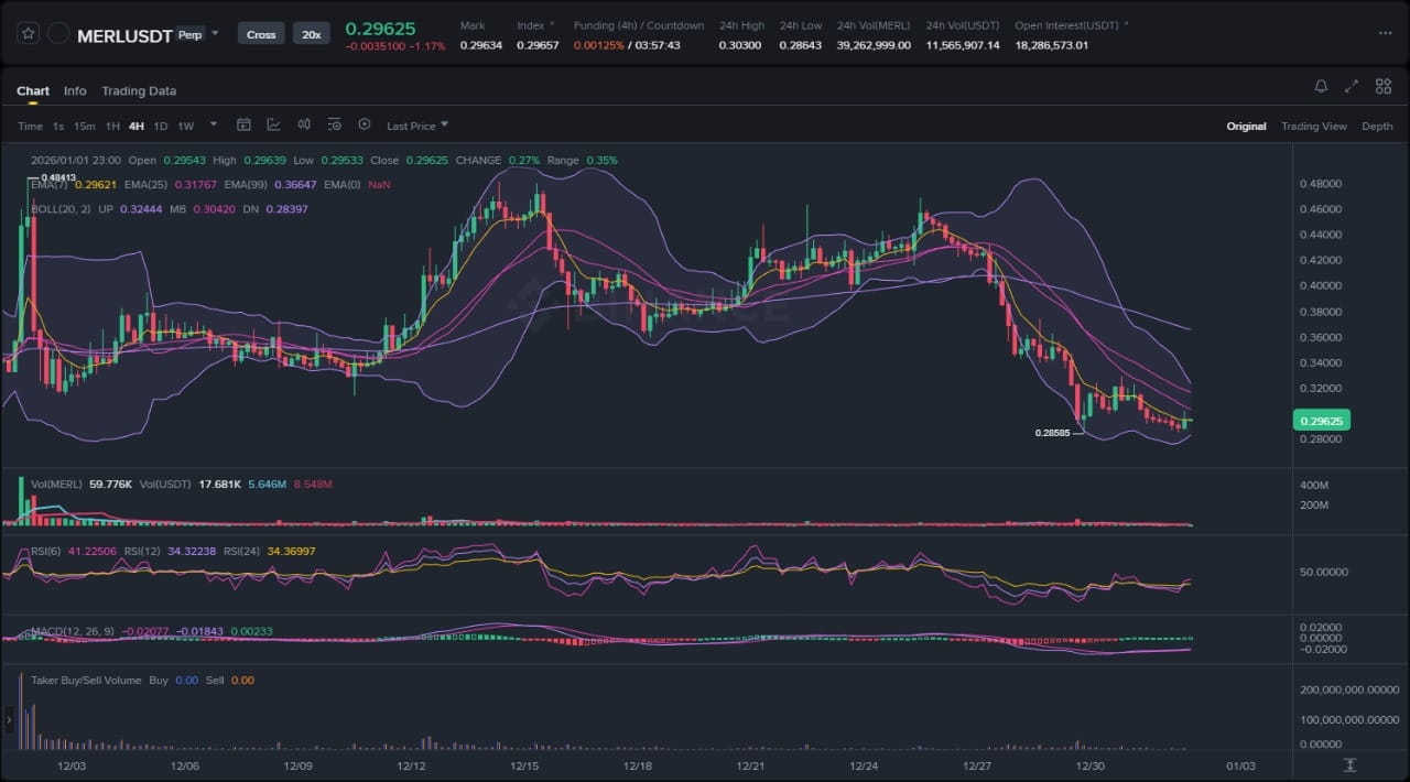 Thị trường cho Merlin Chain (MERL) hiện đang ở một bước ngoặt quan trọng, tạo ra một câu đố kỹ thuật cổ điển cho các nhà phân tích và traders. Sau một giai đoạn phân phối đáng kể từ mức cao cuối tháng 12, giá đã bước vào một giai đoạn hợp nhất rõ nét gần các mức cấu trúc chính. Hành động giá này, được đặc trưng bởi sự giảm thiểu biến động và khối lượng, cho thấy một động thái hướng tới sắp xảy ra. Với sự vắng mặt đáng kể của các yếu tố cơ bản mới, cấu trúc thị trường hiện tại gần như hoàn toàn bị chi phối bởi các yếu tố kỹ thuật và tâm lý thị trường rộng lớn hơn, làm cho việc đọc kỹ biểu đồ trở nên rất quan trọng để dự đoán làn sóng giá tiếp theo.