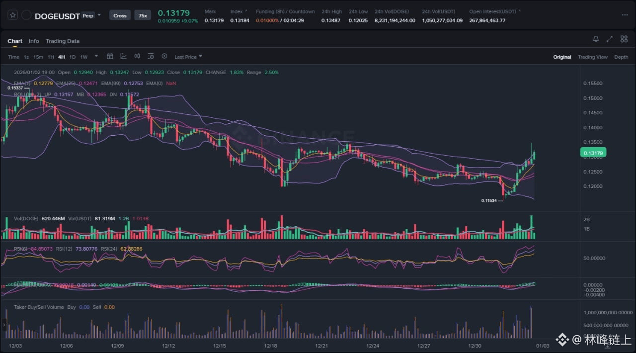 At the time of this analysis, DOGE is trading near 0.13179, marking a significant departure from the recent lows of 0.11534 established just days prior. The price action represents a classic V-shaped recovery, a pattern often associated with a capitulation event followed by a rapid influx of buy-side liquidity. The broader market context suggests a rotation of capital into high-beta assets, with DOGE leading the charge among legacy meme coins. The immediate sentiment has shifted from fear to cautious optimism, driven by a combination of technical reclamation and a resurgence in futures market activity.