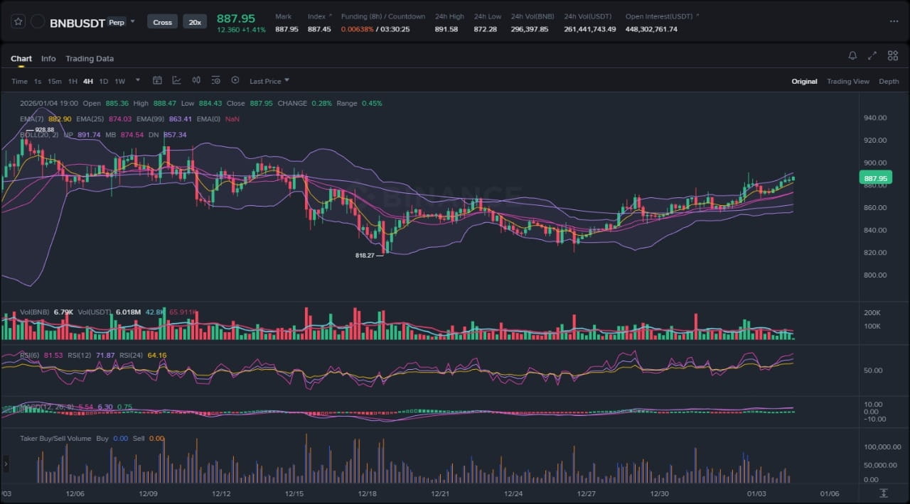 Biểu đồ BNB/USD trên khung thời gian 4 giờ cho thấy một cấu trúc xu hướng tăng rõ ràng, đặc trưng bởi các đỉnh cao hơn và các đáy cao hơn kể từ mức đáy gần đây vào giữa tháng 12. Giá đã hoàn thành một đợt tăng năm sóng mang tính chất bốc đồng từ nền tảng đó, tiếp theo là một giai đoạn hợp nhất ngắn ngay dưới đỉnh swing cao gần đây. Các yếu tố quan sát được bao gồm một sự bứt phá quyết định trên đường EMA 50 kỳ, vị trí gần dải Bollinger trên, và một sự mở rộng của histogram MACD tăng giá xác nhận động lượng. Biến động đã giảm nhẹ trong quá trình hợp nhất, gợi ý về việc tích lũy trước khi mở rộng tiềm năng. Các đỉnh swing địa phương gần mức $890 đánh dấu các vùng thanh khoản kháng cự, trong khi cấu trúc vẫn giữ nguyên mà không có các đáy thấp đáng kể. Xu hướng tổng thể là tăng giá, được thúc đẩy bởi kênh xu hướng tăng bền vững và sự căn chỉnh của các đường trung bình động trong cấu hình tăng giá chồng chéo, cho thấy người mua duy trì kiểm soát khi không có sự phá vỡ.
