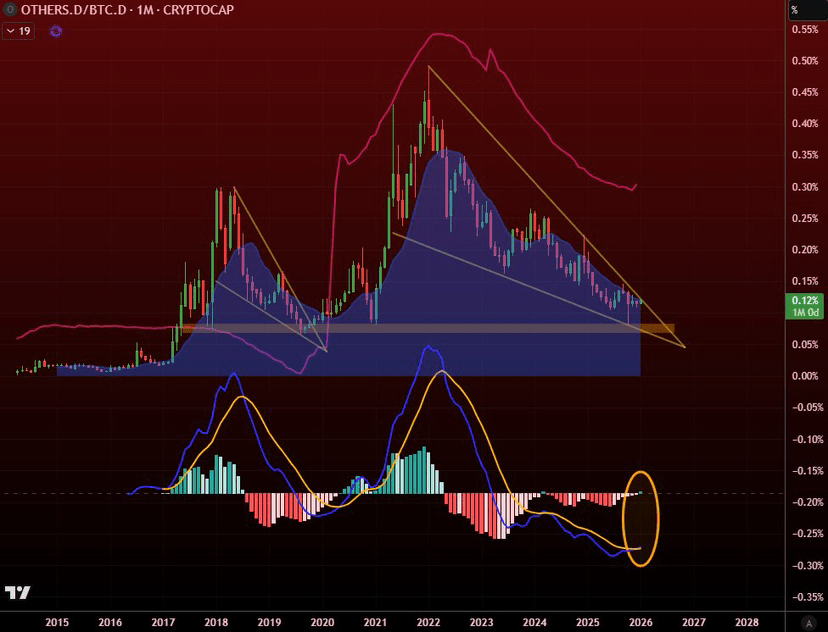 Đây không phải là một tín hiệu nhỏ. Nếu cấu trúc này xác nhận ở lần đóng tháng tới, nó sẽ đánh dấu sự khởi đầu tiềm năng của một thị trường bò trong nhiều năm cho các altcoin so với loại chế độ chuyển đổi mà vốn thường xuyên quay vòng ra khỏi Bitcoin và vào các alt beta cao.