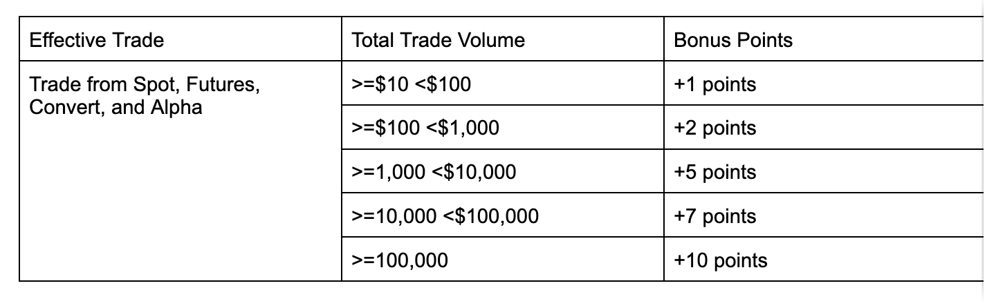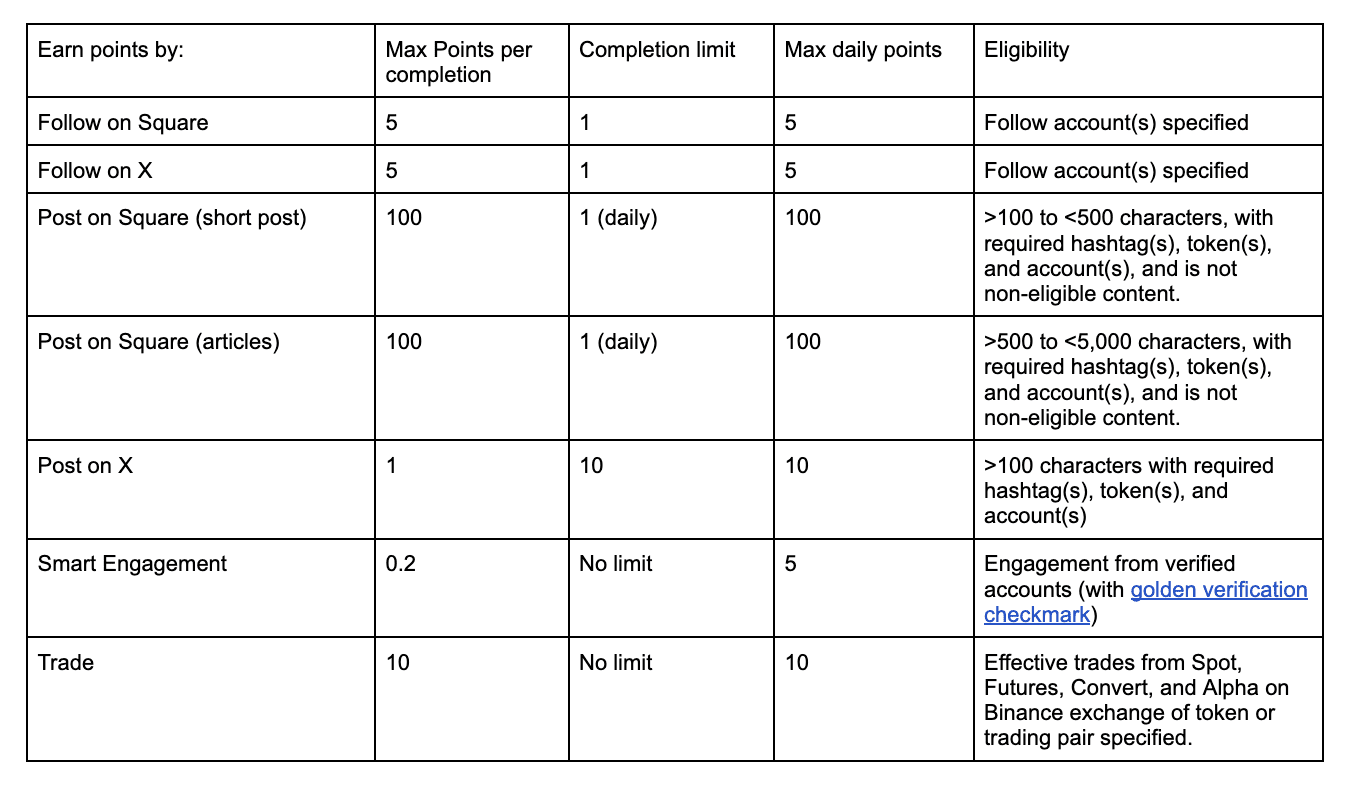 Bạn có thể nhận tối đa 25 điểm mỗi ngày cho mỗi dự án từ các giao dịch hiệu quả mà bạn đã thực hiện trên sàn giao dịch Binance (không bao gồm ví).