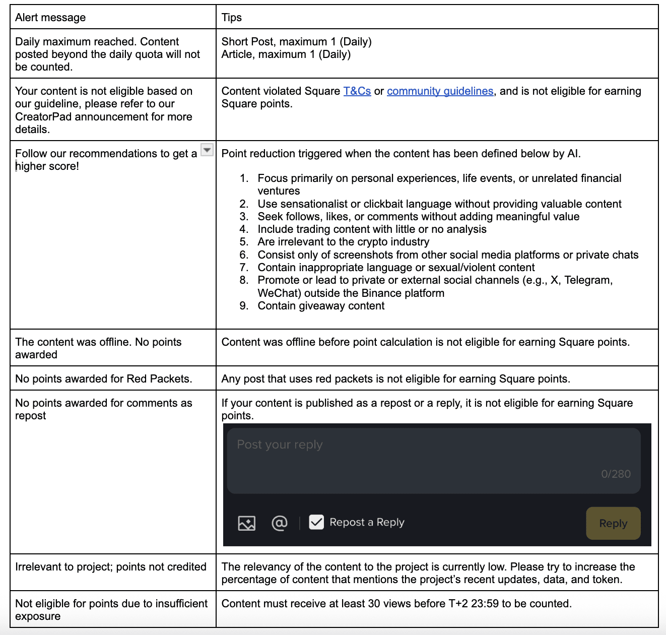 Việc đăng nội dung trùng lặp, sao chép hoặc tương tự đáng kể—dù từ người dùng khác, các bài nộp trước đó, hay nguồn bên ngoài—là hoàn toàn bị cấm. Bất kỳ người dùng nào bị phát hiện đã đăng nội dung trùng lặp sẽ bị coi là không đủ điều kiện để nhận thưởng.