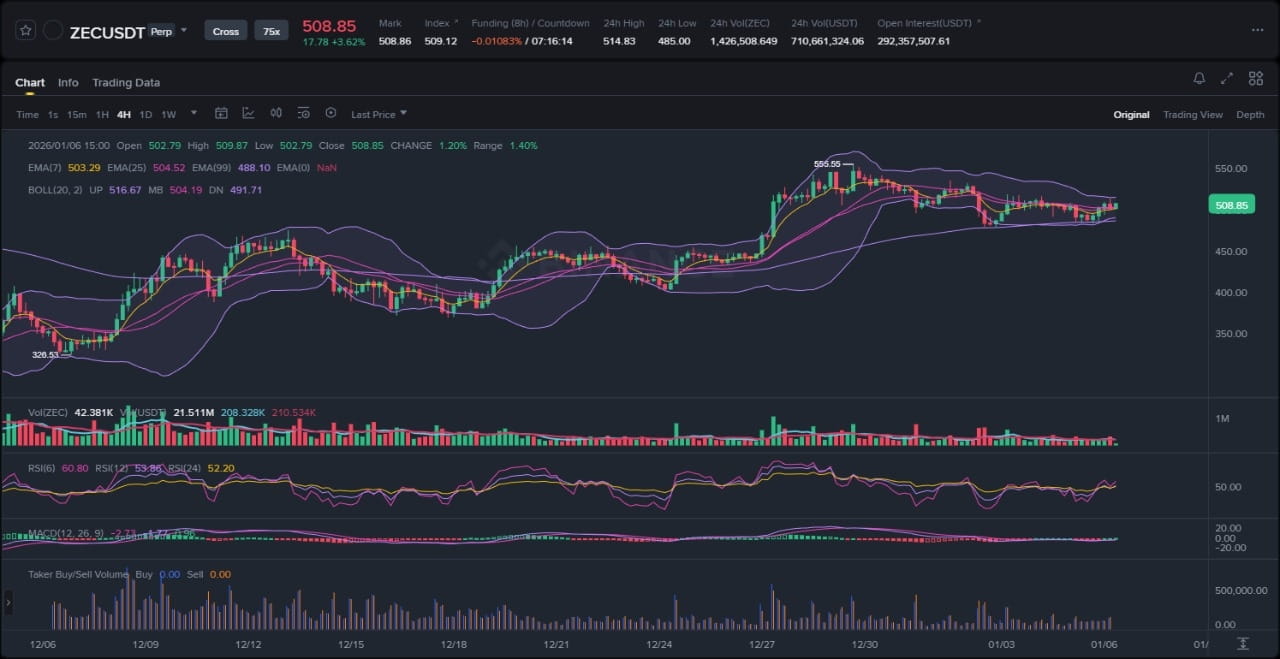 Các tin tức gần đây tạo nên bối cảnh tâm lý hỗn hợp cho ZEC, được tóm lược thành hai chủ đề chính. Chủ đề đầu tiên là sự bền vững cấu trúc giá mang tính tích cực (tăng trưởng) được nhấn mạnh trong các bài báo từ Tokenpost và BeInCrypto ngày 5 tháng 1 năm 2026, cho thấy hành vi giá tích cực của ZEC dù có yếu điểm ngắn hạn, ghi nhận mức tăng gần 40% trong 30 ngày qua sau đợt phục hồi mạnh từ mức thấp đầu tháng 12, với tiềm năng phá vỡ 85% nhưng bị giới hạn bởi sự cạnh tranh từ một đồng tiền mã hóa khác. Điều này nhấn mạnh động lượng tăng trưởng tích cực gắn liền với cải tiến giao thức bảo mật của Zcash và sự phục hồi thị trường. Chủ đề thứ hai là lo ngại bán tháo (giảm giá), theo bài viết của AMBCrypto ngày 6 tháng 1, mô tả việc thất bại lặp lại tại mức 520—có thể là lỗi báo cáo cho một khung thời gian dài hơn hoặc bối cảnh altcoin, nhưng được hiểu là khó vượt qua kháng cự—trong bối cảnh lo ngại bán tháo gia tăng và áp lực lên mức hỗ trợ 485, gợi nhớ đến các động thái tương tự tại mức hiện tại xấp xỉ 0,2029. Tổng thể, tâm lý thị trường xung đột nhẹ với biểu đồ: tin tức tích cực về lợi nhuận hàng tháng ủng hộ xu hướng tăng, nhưng các câu chuyện thất bại ngắn hạn lại phù hợp với các mức từ chối gần đây, ngụ ý một động thái bán sau tin tức hoặc giai đoạn phân phối nơi cơ bản tốt không thể kích hoạt tăng giá ngay lập tức, dẫn đến việc hút thanh khoản tại các mức hỗ trợ.