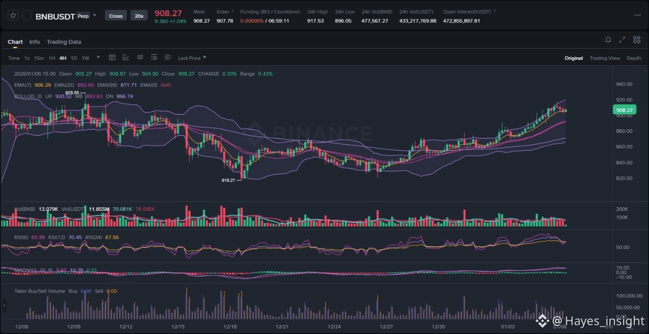 Diving deeper into indicators, RSI (14) hovers around 55 at the $902 level, neutral but climbing from oversold territory below 40 during the recent swing low, supporting accumulation rather than distribution. MACD exhibits bullish momentum with the histogram expanding positively at 8.71 as noted in recent analysis, line above signal, and zero-line crossover intact—this aligns seamlessly with the price compression, where bullish divergence on MACD underscores hidden buying pressure beneath the surface. The high-probability aspect of this $902 zone stems from its confluence as dynamic support via the rising 25/99 EMAs and static range bottom, where prior liquidity sweeps have repeatedly held, forming a robust demand cluster. Volatility contraction via Bollinger Band squeeze amplifies breakout odds, historically preceding 10-20% moves in BNB's cycle. However, sustained closes below $890 would negate this, hinting at range expansion downward into deeper liquidity pools.