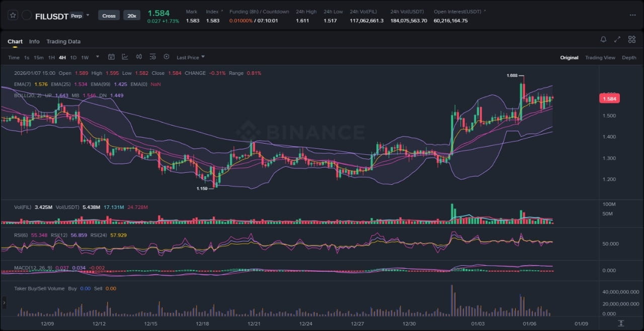 Chủ đề thứ hai xoay quanh động lượng giá vượt trội so với thị trường tiền mã hóa nói chung, khi FIL tăng 6% lên mức 1,59 đô la vào ngày 5 tháng 1, theo Tokenpost, trong bối cảnh khối lượng lớn cho thấy nhu cầu mạnh mẽ. Động thái giao dịch và thị trường này cũng mang tính tích cực, phản ánh sự bền bỉ của FIL và khả năng thu hút dòng vốn trong các đợt tăng trưởng thị trường. Một bài báo khác từ CoinDesk cùng ngày cũng củng cố điều này với phần "Biểu đồ của Ngày", nhấn mạnh sự tăng trưởng của token trong bối cảnh hoạt động gia tăng. Không có yếu tố tiêu cực hay trung lập nào xuất hiện trong các cập nhật này, tạo nên một câu chuyện nhất quán về các yếu tố thúc đẩy tích cực. Quan trọng hơn, tâm lý tin tức hài hòa hoàn toàn với cấu trúc biểu đồ tích cực, tránh được các động thái bán sau tin tức hoặc tín hiệu phân phối; thay vào đó, nó cho thấy quá trình tích lũy, nơi các đợt tăng khối lượng xác nhận nỗ lực phá vỡ mà không bị suy yếu ngay lập tức.