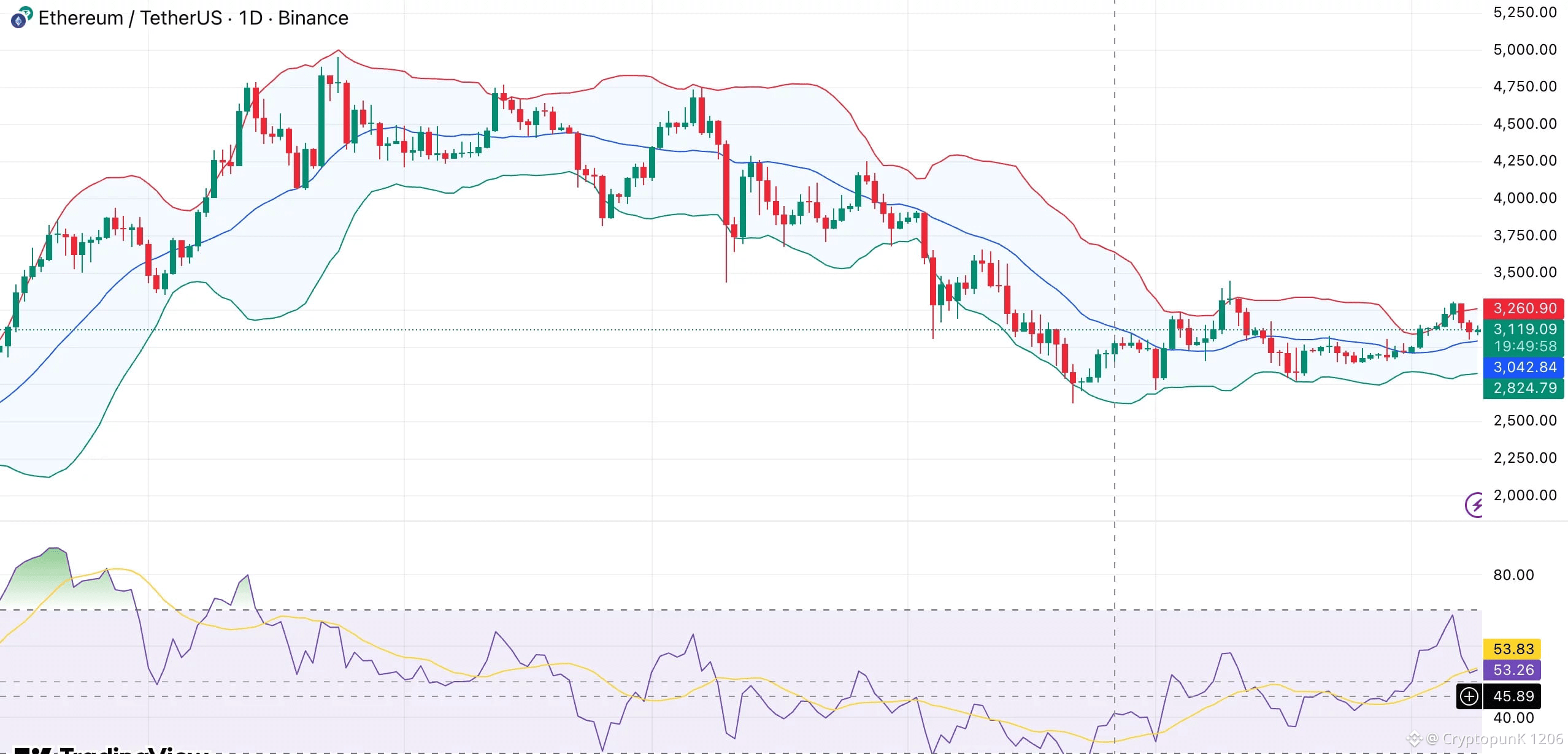Hiện tại, giá ETH đang dao động ở trục giữa của dải Bollinger Bands. Đáng chú ý, giá đã nhiều lần bị từ chối khi chạm dải trên — khu vực trùng khớp với vùng kháng cự mạnh $3.300.