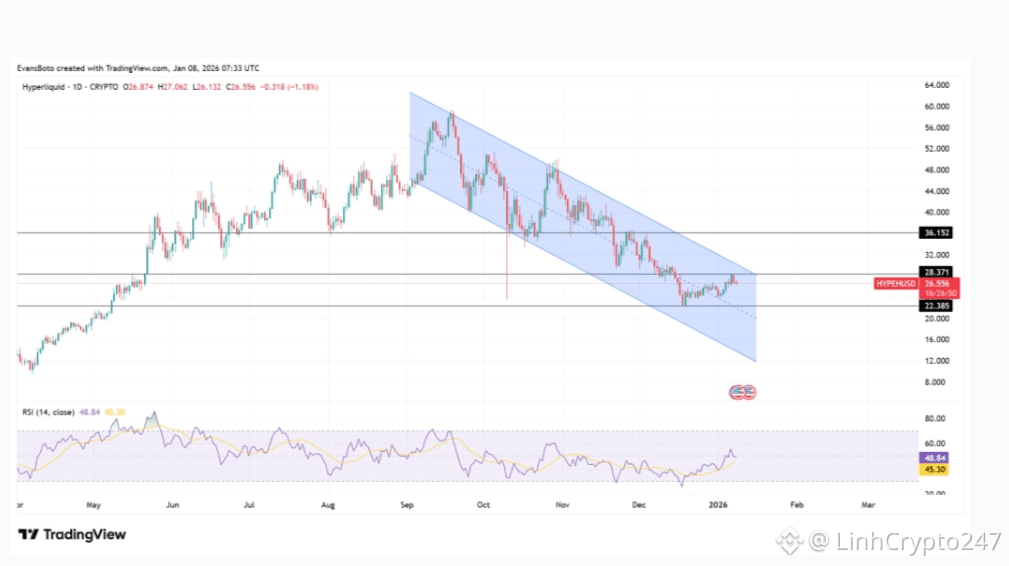 On the daily chart, HYPE remains firmly confined within a well-defined descending channel, characterized by a sequence of lower highs since September.