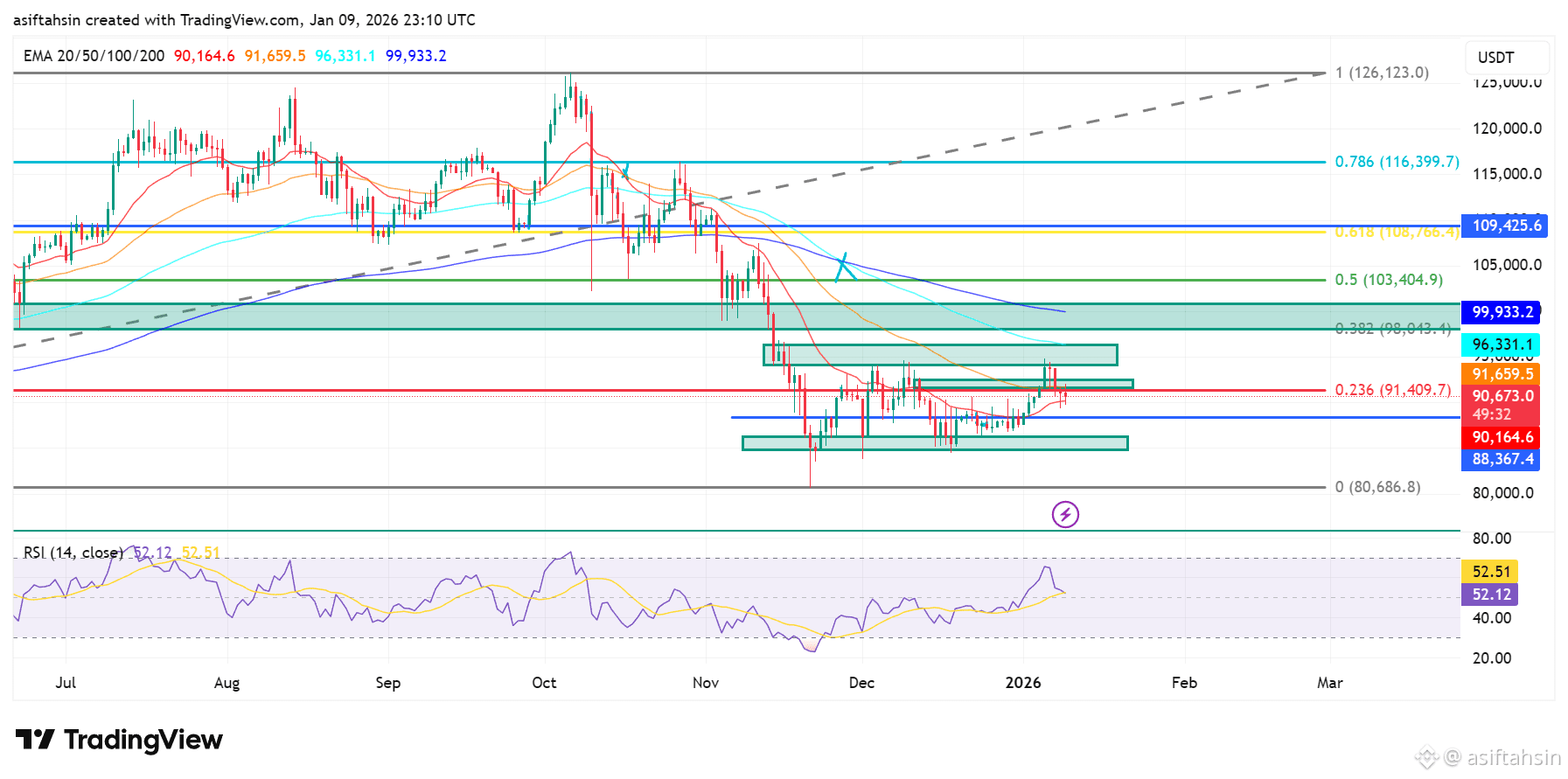 BTC is consolidating above the $88k–$90k major demand zone, where buyers previously defended aggressively. Recent price action shows higher lows, suggesting a base-building phase and increasing probability of a short-term relief rally.