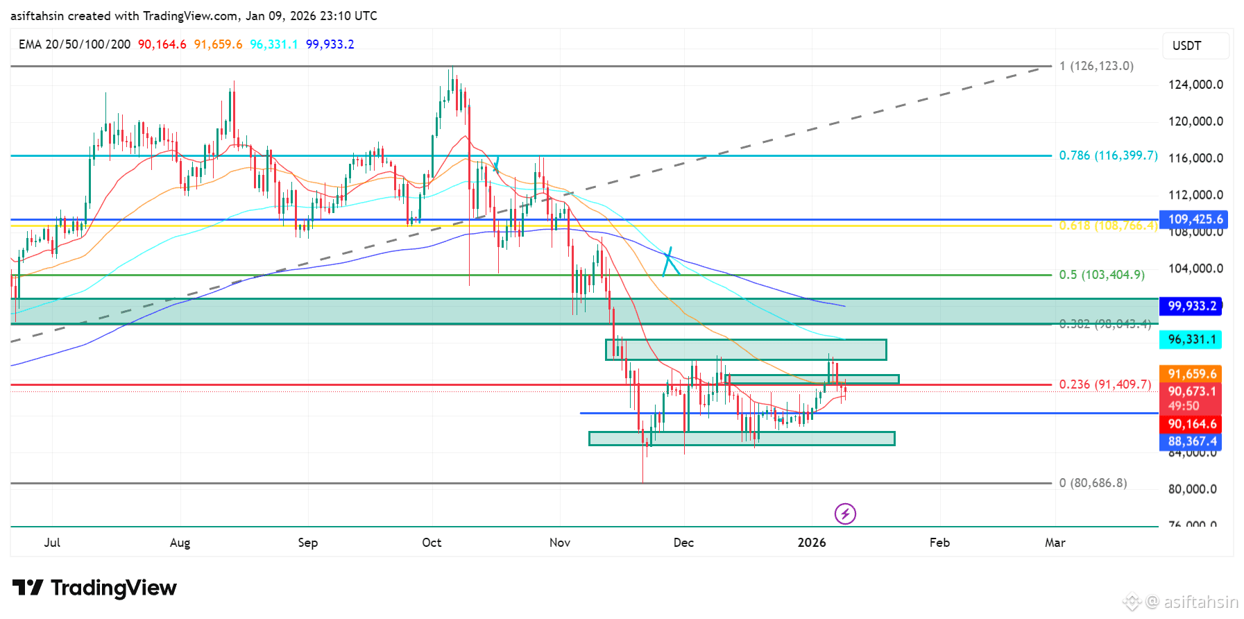 A sustained move above $91.4k (0.236 Fib) opens upside toward $98k–$103k, where strong Fibonacci, EMA, and structural resistance exists. A meaningful trend shift would require acceptance above $103k (0.5 Fib).