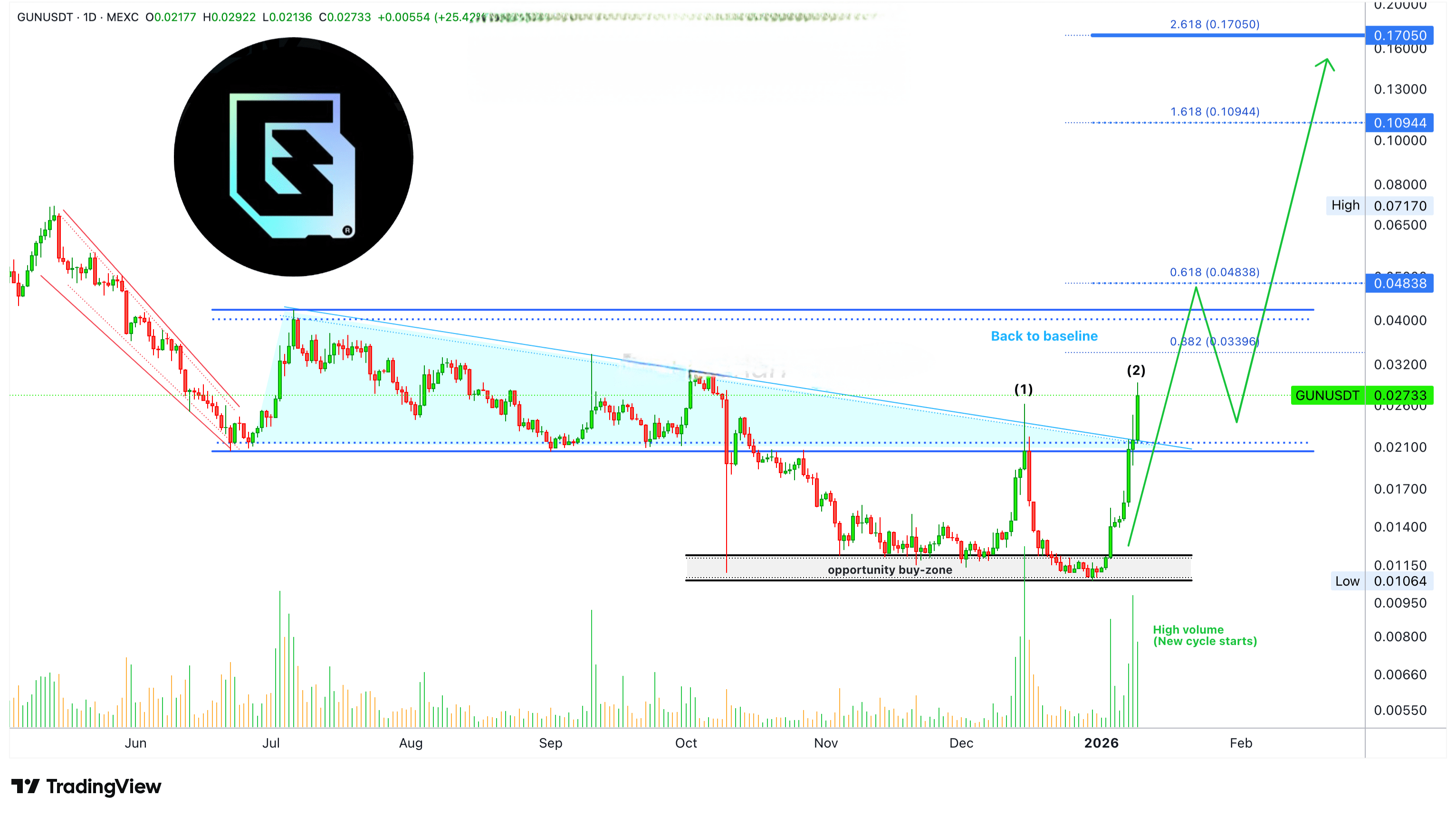 GUNUSDT bắt đầu di chuyển và đạt đỉnh vào ngày 15 tháng 12 năm 2025. Nó đã cố gắng vào 'mức cơ sở' nhưng bị từ chối. Kháng cự đã được xác nhận và giá giảm xuống, di chuyển trong vùng tiêu cực.