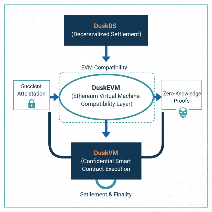 DuskDS (Dữ liệu & Lớp Giải quyết): Đây là lớp cơ sở bảo mật. Nó xử lý sự đồng thuận, tính khả dụng của dữ liệu và thanh toán cuối cùng bằng cách sử dụng giao thức Chứng thực Ngắn gọn của Dusk, một cơ chế bằng chứng cổ phần đảm bảo tính cuối cùng nhanh chóng, xác định—không có việc đảo ngược giao dịch một khi chúng đã được thanh toán.