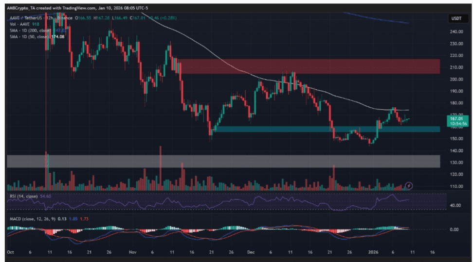 Từ góc độ kỹ thuật, những người mua AAVE đã thực hiện hai lần thử nghiệm không thành công kể từ tháng 12 để lấy lại mức trung bình động 50 ngày (MA) gần $174. Mặc dù những thất bại này, mức này vẫn là một ngưỡng kỹ thuật quan trọng để khôi phục cấu trúc thị trường tăng giá và hỗ trợ một sự phục hồi bền vững hơn.