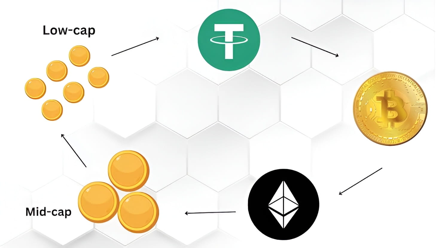 Hiểu được chu kỳ chuyển động tiền tệ là bản đồ kho báu quan trọng nhất trong Crypto. Tiền thông minh không di chuyển một cách ngẫu nhiên; nó tuân theo quy luật của nước, chảy từ nguồn thanh khoản sâu nhất như Bitcoin đến những tài sản rủi ro cao nhất như các đồng tiền nhỏ, memecoin để tối đa hóa lợi nhuận trước khi rút lui về nơi an toàn là Stablecoin.