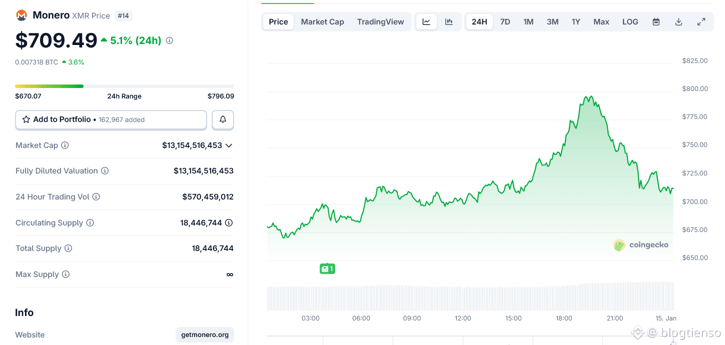 Vào thứ Tư, Monero đã leo lên mức cao kỷ lục mới, vượt qua mốc 797 đô la khi các nhà đầu tư đổ xô vào các loại tiền điện tử tập trung vào quyền riêng tư. Động thái này đã khép lại một tuần tăng giá mạnh, giúp XMR tăng hơn 50%, trở thành một trong những loại tiền điện tử có hiệu suất mạnh nhất trên thị trường.