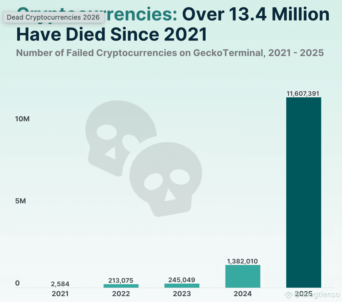 Quý IV năm 2025 được xem là thời điểm tồi tệ nhất. Chỉ trong vòng ba tháng, có tới 7,7 triệu token thất bại — chiếm khoảng 35% tổng số dự án crypto “chết” kể từ năm 2021.