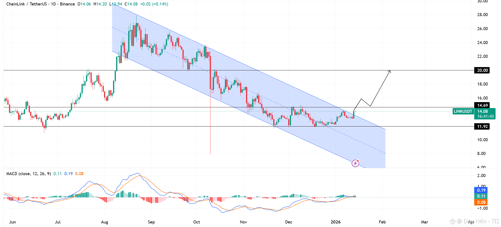 🔸Về mặt kỹ thuật, $LINK đã chính thức phá vỡ kênh giảm giá kéo dài nhiều tháng tại vùng $14. Việc giá trụ vững trên mức này kết hợp với nguồn cung trên sàn liên tục sụt giảm đang tạo ra áp lực khan hiếm, ủng hộ cho đà tăng tiếp diễn.