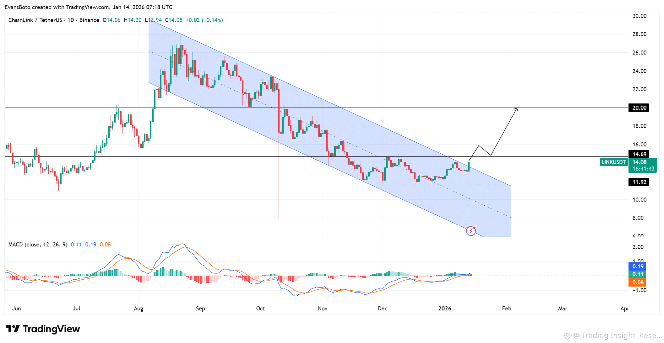 Giá đã phá vỡ kênh giảm kéo dài nhiều tháng quanh vùng giữa $14 và ổn định thành công phía trên nó. Kháng cự cũ nay đã trở thành hỗ trợ xác nhận.