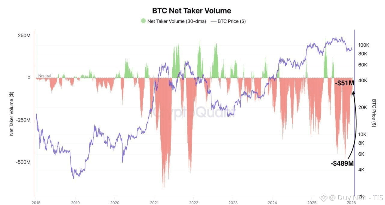 🔸Cụ thể, chỉ số Net Taker Volume từng đạt đỉnh bán ròng tới -489 triệu USD, nhưng hiện tại con số này chỉ còn vỏn vẹn -51 triệu USD. Tức là lực xả đã giảm gần 10 lần. Dù phe bán vẫn đang chiếm ưu thế nhẹ, nhưng sự quyết liệt đã biến mất hoàn toàn.
