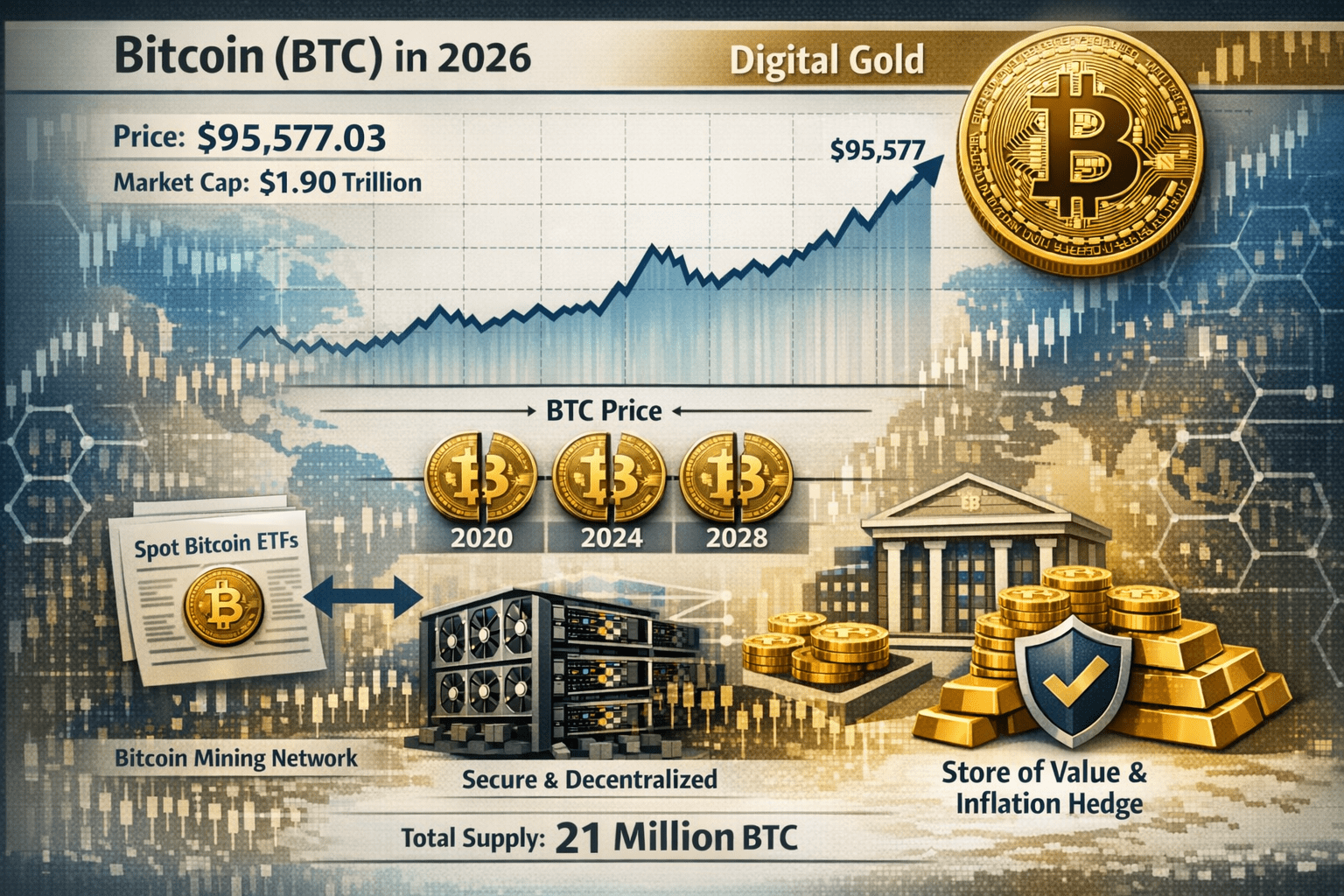 $BTC Bitcoin (BTC) vẫn là loại tiền mã hóa nổi bật và có ảnh hưởng lớn nhất năm 2026, thường được gọi là "vàng kỹ thuật số" nhờ lượng cung cố định là 21 triệu đồng. Tính đến ngày 16 tháng 1 năm 2026, BTC vẫn duy trì vị thế dẫn đầu trên thị trường với giá giao động quanh mức 95.577,03 USD, tương ứng với vốn hóa thị trường gần 1,90 nghìn tỷ USD. Giá trị này được hỗ trợ bởi tính phi tập trung và cơ chế giảm phát, diễn ra mỗi bốn năm nhằm giảm tốc độ phát hành đồng tiền mới và duy trì tính khan hiếm. Sự tham gia của các tổ chức tài chính đã đạt đến mức độ mới, với các quỹ ETF Bitcoin dạng Spot và các tài sản dự trữ doanh nghiệp hiện đang nắm giữ một phần đáng kể lượng cung lưu hành. Mặc dù giá có thể biến động mạnh, nhiều nhà đầu tư vẫn sử dụng nó như một công cụ phòng ngừa lạm phát dài hạn và là nơi lưu trữ giá trị chính. Bảo mật của Bitcoin được duy trì bởi một mạng lưới người khai thác toàn cầu, sử dụng sức mạnh tính toán khổng lồ để xác minh các giao dịch trên một sổ cái công khai và không thể thay đổi. Là tài sản kỹ thuật số đầu tiên và lớn nhất, Bitcoin tiếp tục định hình xu hướng cho toàn bộ thị trường tiền mã hóa, ảnh hưởng đến hiệu suất của hầu hết các loại tiền khác. #BTC #CryptoMarkets #btc70k