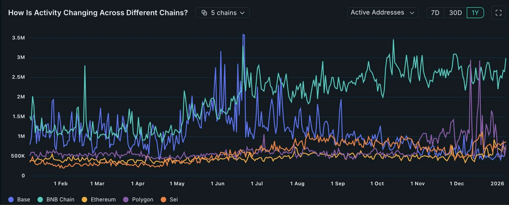 Theo dữ liệu từ Nansen, BNB Chain đã dẫn đầu về số lượng địa chỉ hoạt động sau tháng 7 năm 2025 và duy trì mức độ cao thay vì trải qua những đợt bùng nổ nhất thời. Polygon và Sei chứng kiến những đợt tăng đột biến định kỳ, thường liên quan đến các sự kiện cụ thể. Trong khi đó, hoạt động của BNB Chain duy trì ở mức ổn định nhưng cao — một dấu hiệu rõ ràng cho thấy người dùng quay lại thay vì lưu lượng truy cập mang tính đầu cơ.